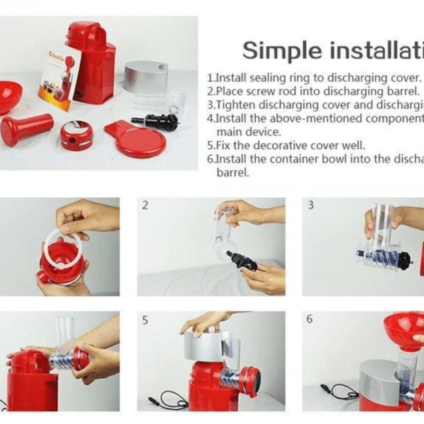 За да приготвите здравословен десерт първо обелете, нарежете и замразете плодовете, които желаете. Можете да смесвате различни видове според вкуса си, да им добавяте разнообразни подобрители или кремове. Включете машината в ел. мрежа и поставете в указаното място замръзналите плодове, включете и притискайте с ръчното, бутало за да се придвижат продуктите към ножа.