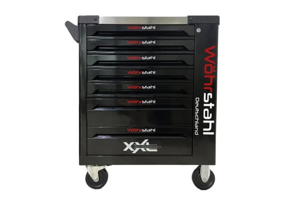 Инструменталната количка Wöhrstahl 7/7 е вашето мобилно решение за максимална организация и удобство в работилницата. Доставя се с пълен комплект от 419 професионални инструмента, разпределени в 7 чекмеджета с „soft-close“ механизъм и защита от накланяне за сигурност при работа.