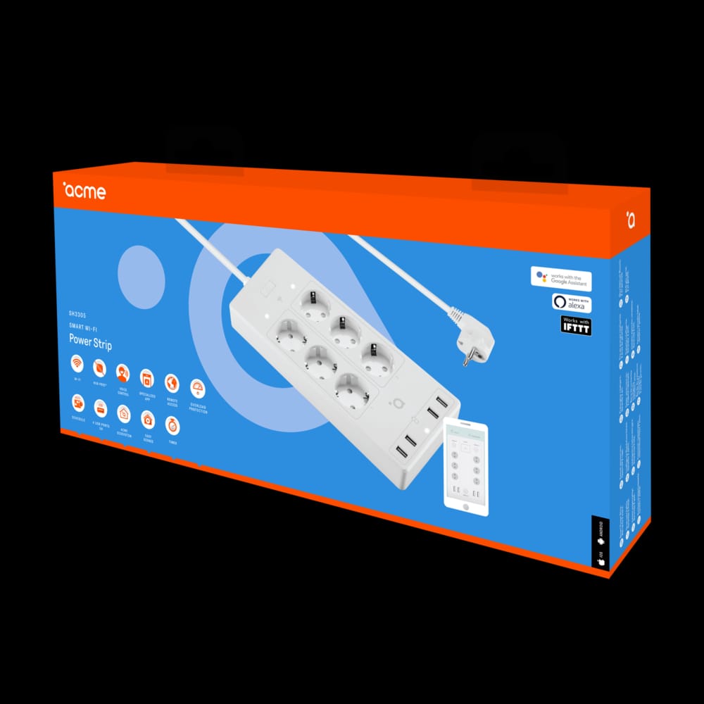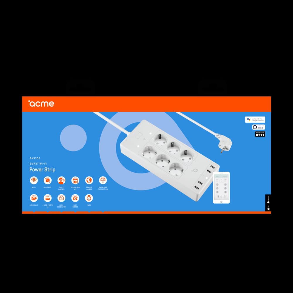 ACME SH3305 Smart Wi-Fi Power Strip може да превърне всеки електроуред в интелигентен! 10 от тях наведнъж, за да бъдем точни! Свържете вашите устройства, като използвате 6-те контакта и 4 USB порта. Едно приложение за управление на зареждане на устройства, осветление или дори електрическо отопление. Забравихте да изключите нагревателя преди да тръгнете? Не е проблем! Сега можете да го направите дистанционно чрез приложението Smart Life. Притеснявате се, че мечтаният ви интелигентен дом ще претовари ACME SH3305 Smart Wi-Fi Power Strip? Този модел се предлага с вграден прекъсвач. Ако има някакъв шанс за претоварване, захранващата лента просто ще се изключи. Оставете вашата фантазия да се разхожда безплатно и станете владетел на вашия собствен интелигентен дом!