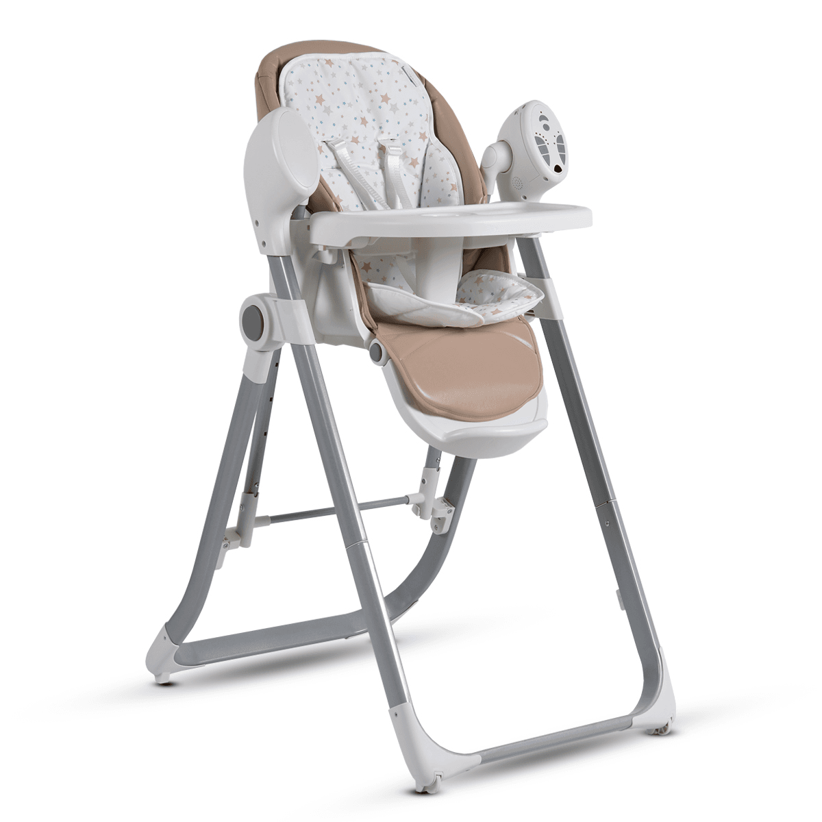 За максимално удобство по време на хранене, столът има 6 степени за регулиране височината на седалката, както и 3 позиции на лягане на облегалката и 3 позиции на ъгъла на поставката за крачета