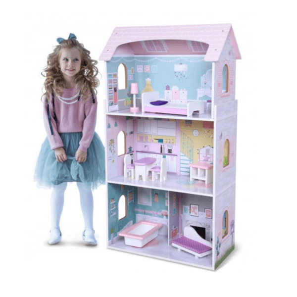 Подарете на Вашето малко момиче едно страхотно изживяване с тази оригинална играчка – дървена къща за кукли с обзавеждане.